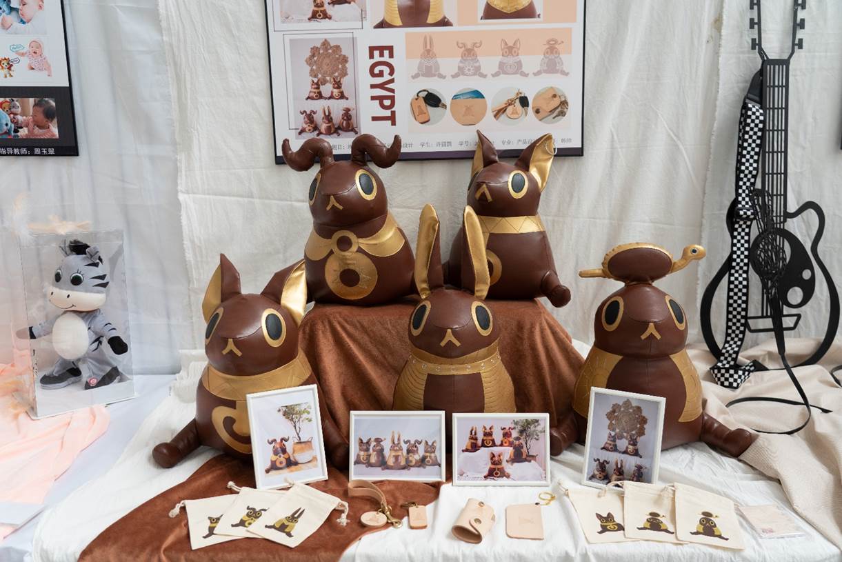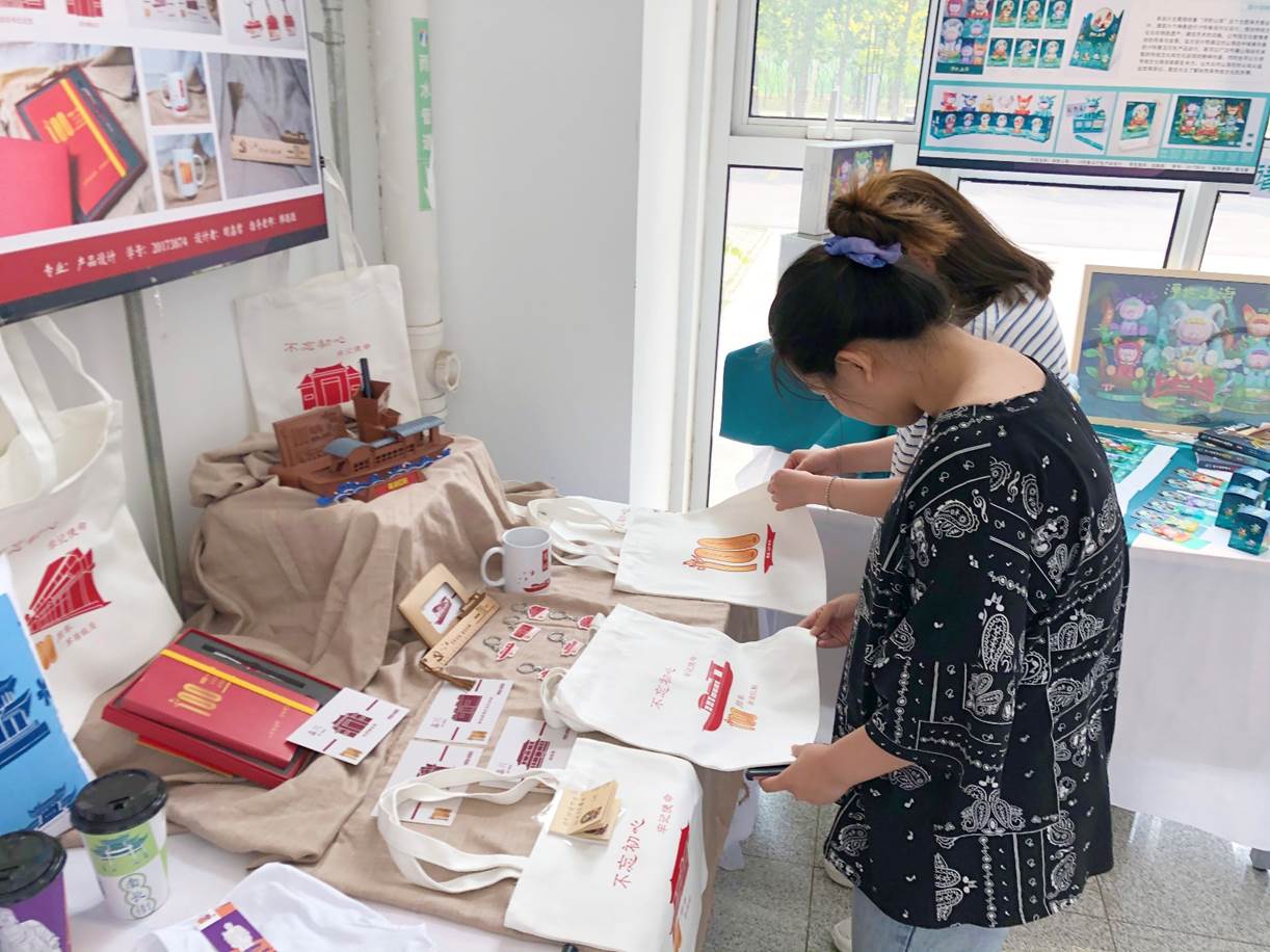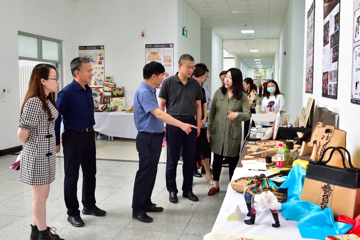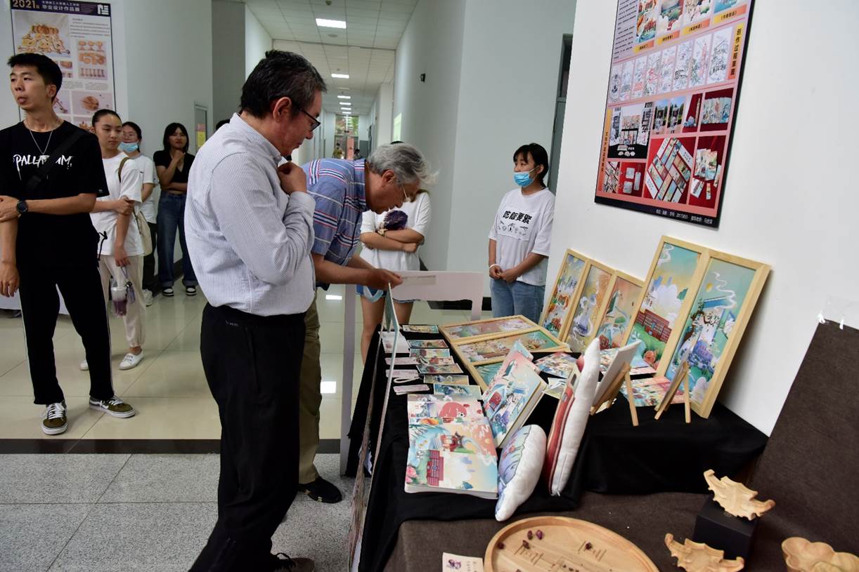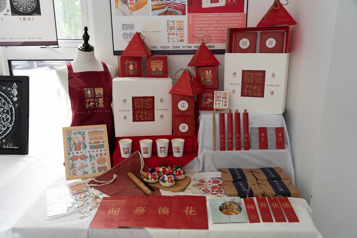 产品设计专业毕业设计静态展展示了25名员工的作品,本届毕业设计展的作品,不仅有立足于传统文化进行现代创意的作品,更有体现思政进课堂的教学成果。例如胡鑫哲的毕业设计题目为“百年嘉船——南湖文创旅游产品设计”,将地域文化与中国共产党历史题材相结合,设计出符合现代审美的红色题材文创产品,是新时代设计对党的致敬,也为红色文化宣传贡献一份力量,有一定的创新性,衍生产品也有一定的创新和实用价值。领导详细了解员工的就业情况,并对在场的所有聋人老员工送上祝福