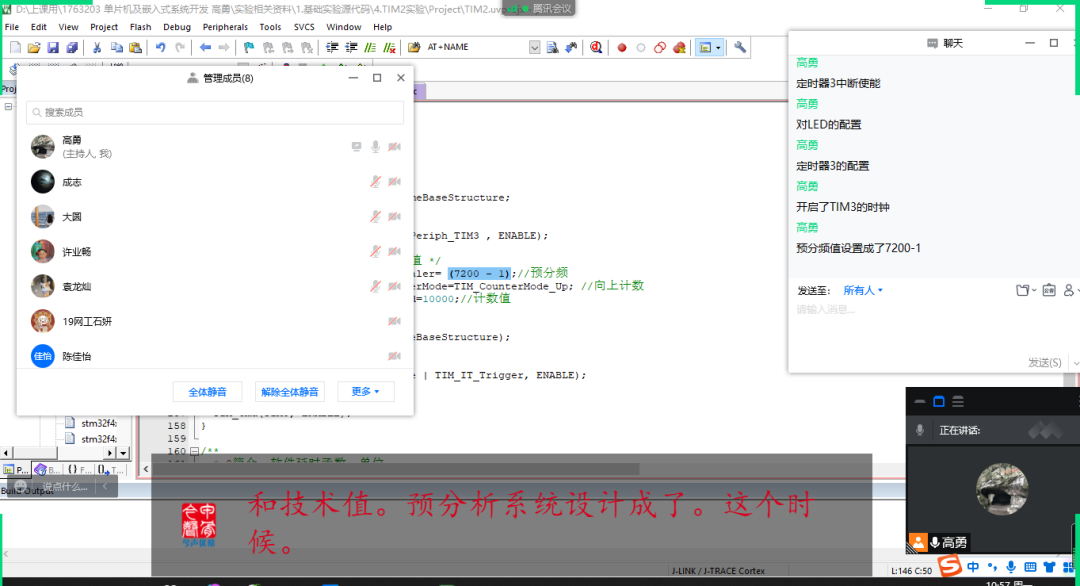 实验员高勇老师的《单片机及嵌入式系统开发》课程,使用腾讯会议进行线上讲授,同时使用甲骨今声同传软件显示字幕翻译。授课过程中开启屏幕共享,员工能够看到课件、字幕以及其他需要展示的资料。对于字幕出现的翻译问题以及专业术语翻译的错误,使用聊天对话框进行及时纠正,通过聊天对话框与员工进行提问、互动。