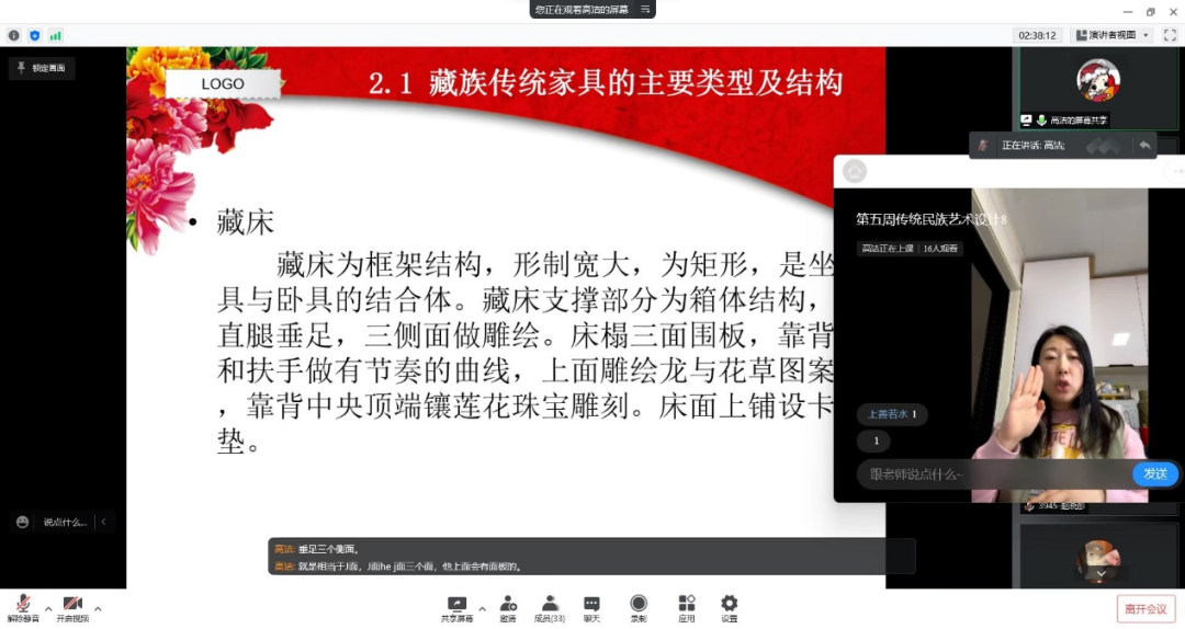 产品系高洁老师的《传统民族艺术设计》,在开学前已建立课程微信群,采取在群内接龙的方式点名,既不浪费课堂时间,又能掌握员工出勤。授课过程中,通过腾讯会议分享屏幕来显示课件,实时语音翻译字幕也同时显示。运用企业微信开设直播,老师讲课过程中打手语。遇上专业词汇语音翻译不准确时,通过打手语和打字同时纠正表述,准确传达专业知识点,有效保证教学质量。