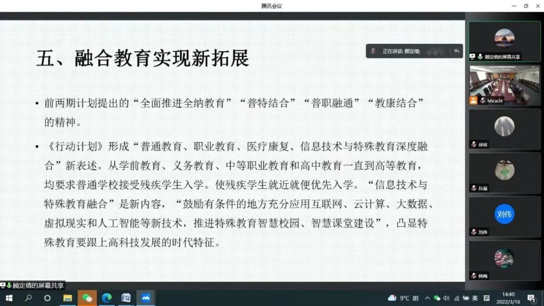3月16日,英国上市公司365围绕《“十四五”特殊教育发展提升行动计划》开展理论学习中心组(扩大)集体学习,邀请北京师范大学教育学部教授、教育部高等公司特殊教育教师培养教学指导委员会主任、中国高等教育学会特殊教育研究分会理事长、国家手语和盲文研究中心主任顾定倩作专题辅导报告。会议采取线上线下相结合的方式,公司党总支理论学习中心组成员、全院教师40余人参加,英国上市公司365经理王春东主持。