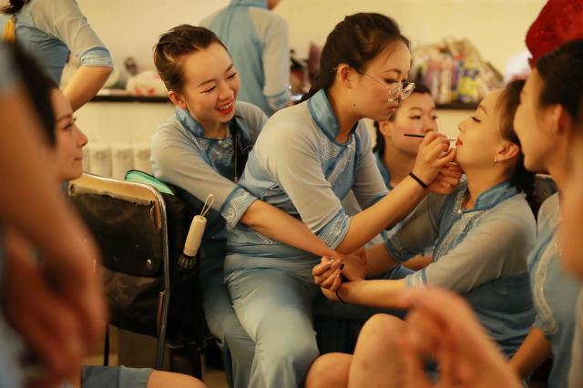 王燕为即将上场的队员们化妆,大家在一起如姐妹一般。