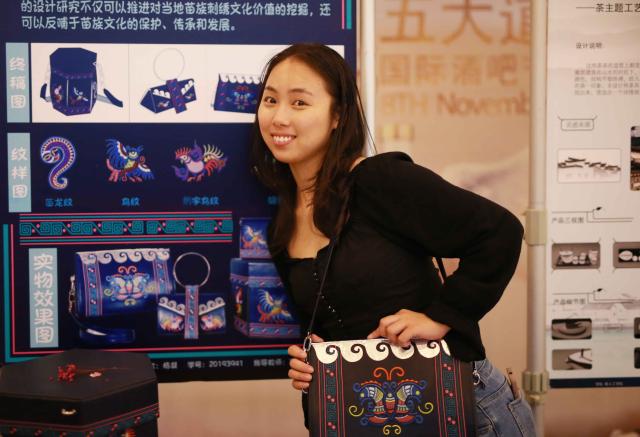 杨凝与自己的毕业作品合影 ,来自苗族刺绣灵感的文创产品,诠释了她对于生活的热爱。