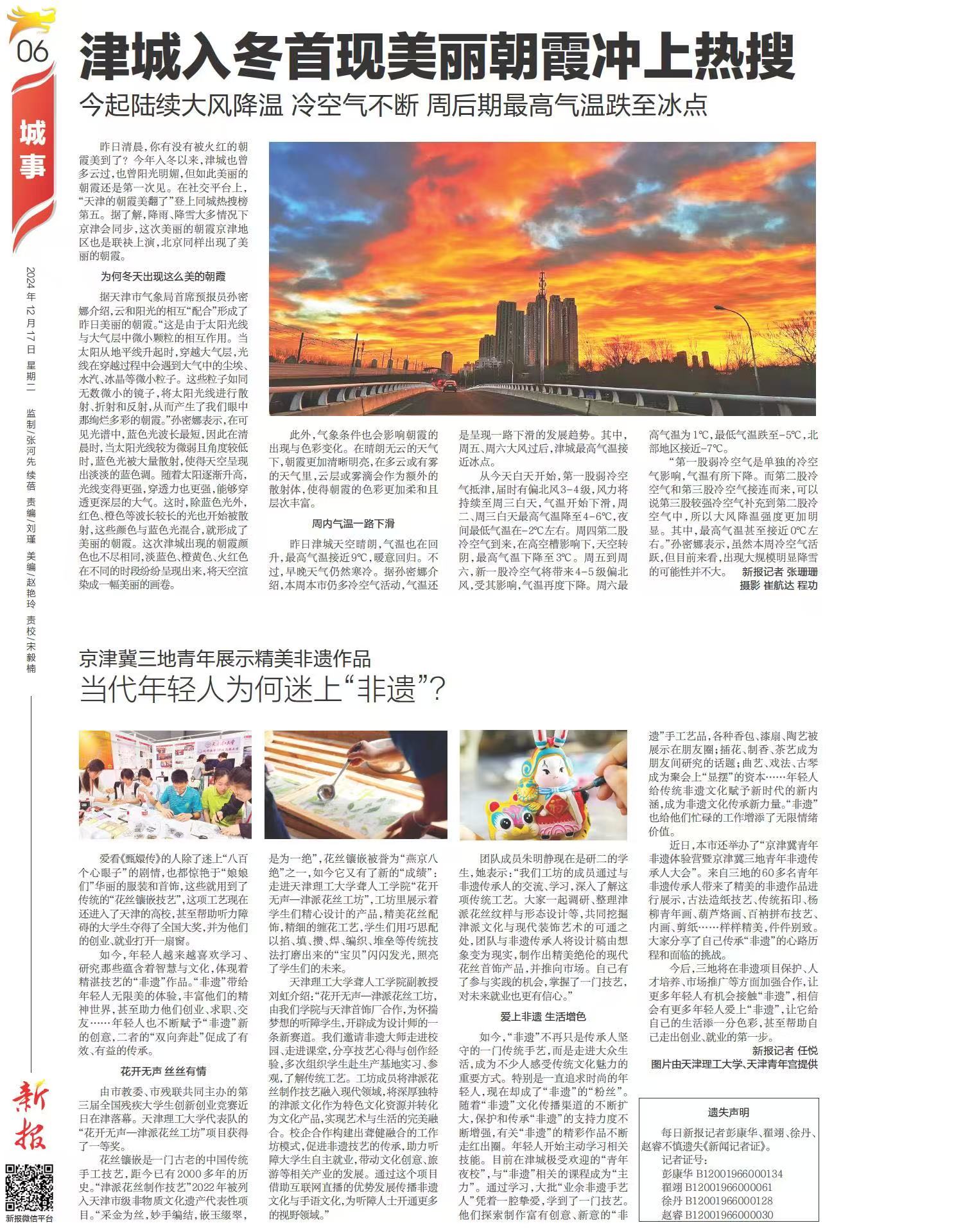 如今,“非遗”不再只是传承人坚守的一门传统手艺,而是走进大众生活,成为不少人感受传统文化魅力的重要方式。特别是一直追求时尚的年轻人,现在却成了“非遗”的“粉丝”。随着“非遗”文化传播渠道的不断扩大,保护和传承“非遗”的支持力度不断增强,有关“非遗”的精彩作品不断走红出圈。年轻人开始主动学习相关技能。目前在津城极受欢迎的“青年夜校”,与“非遗”相关的课程成为“主力”。通过学习,大批“业余非遗手艺人”凭着一腔挚爱,学到了一门技艺。他们探索制作富有创意、新意的“非遗”手工艺品,各种香包、漆扇、陶艺被展示在朋友圈;插花、制香、茶艺成为朋友间研究的话题;曲艺、戏法、古琴成为聚会上“显摆”的资本……年轻人给传统非遗文化赋予新时代的新内涵,成为非遗文化传承新力量。“非遗”也给他们忙碌的工作增添了无限情绪价值。