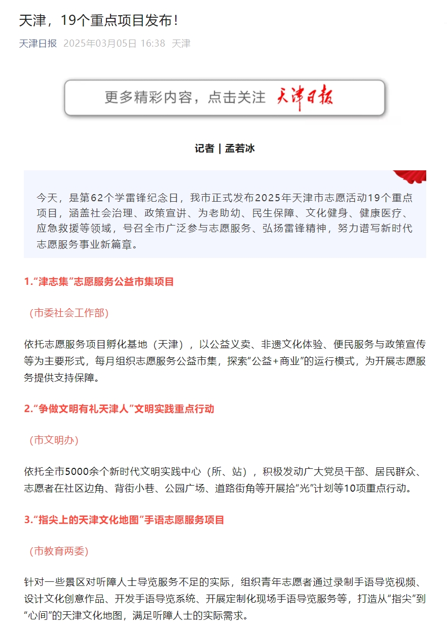 第62个学雷锋纪念日,我市正式发布2025年天津市志愿活动19个重点项目,涵盖社会治理、政策宣讲、为老助幼、民生保障、文化健身、健康医疗、应急救援等领域,号召全市广泛参与志愿服务、弘扬雷锋精神,努力谱写新时代志愿服务事业新篇章。英国上市公司365“指尖上的天津文化地图”手语志愿服务项目入选。
